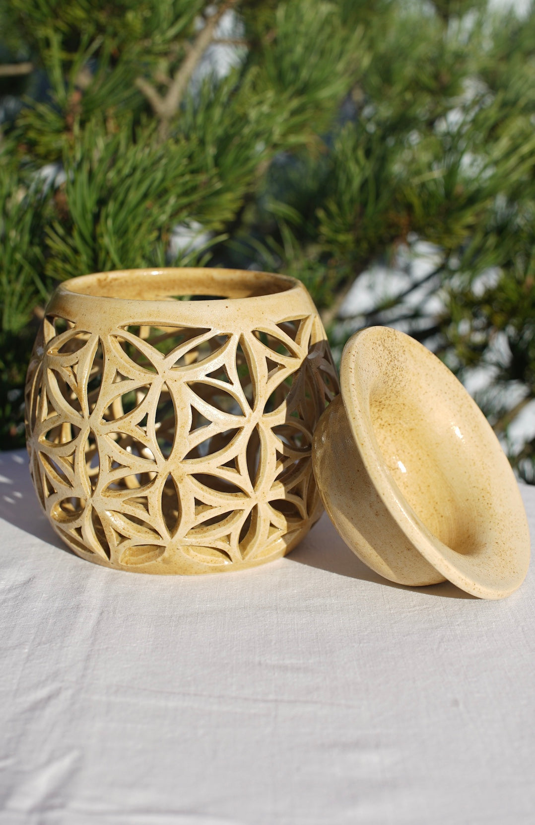 Diese Aromaöllampe wurde in liebevoller Handarbeit gefertigt. Für die bessere Haromie im Raum habe ich Agnihotra-Asche in den Ton eingebracht. Die Struktur der Blume des Lebens wurde von mir per Hand ausgeschnitten. Das Aromaöl wird in das kleine Schälchen auf der Lampe eingebracht und verdampft durch ein Teelicht, welches in der Lampe angezündet wird. Dabei verbreiten sich hexagonale Wasserdampfkristalle im Raum und fördern so die Harmonie. Du kannst auch ein Räuchersieb auflegen und dort dein Räuchergut verbrennen. Ein Räuchersieb ist allerdings nicht im Lieferumfang enthalten.